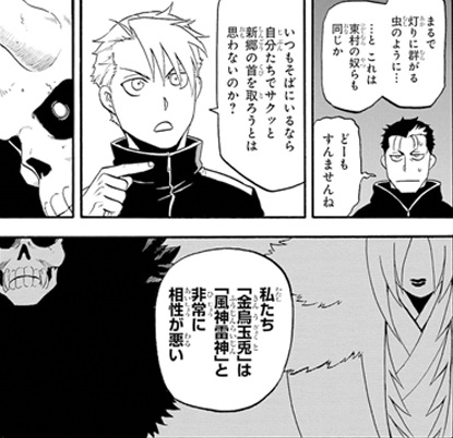 ちなみに金烏玉兎(朝霧&夜桜)自体は実はもっと早くから登場していて、アスマと同じ10話に彼の周囲を飛び回る蝶(=朝霧)の姿が描かれています。